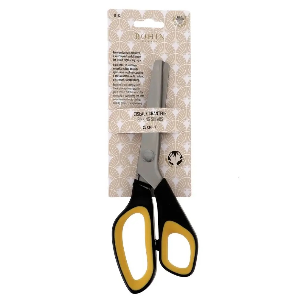 Ciseaux qualité professionnelle 23 cm, coupe ultra précise et ambidextres. Laissez-vous séduire par la qualité de coupe exceptionnelle de nos ciseaux cranteurs . Les lames sont en acier inoxydable, le manche et les anneaux sont en plastique pour offrir une résistance à toutes épreuves et un confort de coupe inégalée. Légers, dotés d’un grip effet soft, ces ciseaux crantés sont un outil indispensable de couture. Pourquoi utiliser les ciseaux cranteurs dans vos travaux de couture ? Les ciseaux couture lame crantée permettent d’éviter le surfilage des bords des tissus. Ils vous permettront de réaliser des découpes fantaisies et des bords décoratifs sur différents supports. Ce superbe ciseau à cranter vous permettra d’exprimer votre créativité sur tous vos tissus pour réaliser des finitions soignées. Grâce à la robustesse du ciseau cranté vous pourrez également couper plusieurs couches de tissus en même temps. Côté ergonomie, et usage la grande taille de l’anneau inférieur permet de glisser plusieurs doigts ce qui répartit les points de pression et atténue la fatigue lors de coupes répétées.